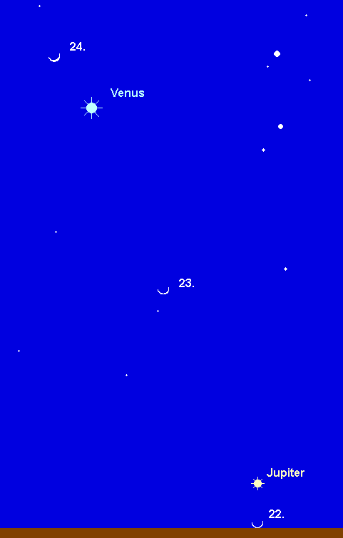 steht zu Monatsbeginn bei Dämmerungsende bereits tief über dem westlichen Abendhorizont und wird in der letzten Märzwoche unsichtbar. Der –2.1m helle Riesenplanet wandert durch das Sternbild Fische. Seine Untergänge verlagern sich von 20:45 MEZ auf 19:30 MEZ (20:30 MESZ). Die Venus überholt Jupiter in den ersten Monatstagen. Am 2. März steht sie nur 0.5° rechts oberhalb des Gasplaneten. Am 22. März steht die schmale Mondsichel 2.5° unterhalb des größten Planeten unseres Sonnensystems. Am 27./28. März schließlich passiert Merkur den Planeten in einem nördlichen Abstand von 1.6°. Diese Konstellation kann wohl nur im Fernglas beobachtet werden