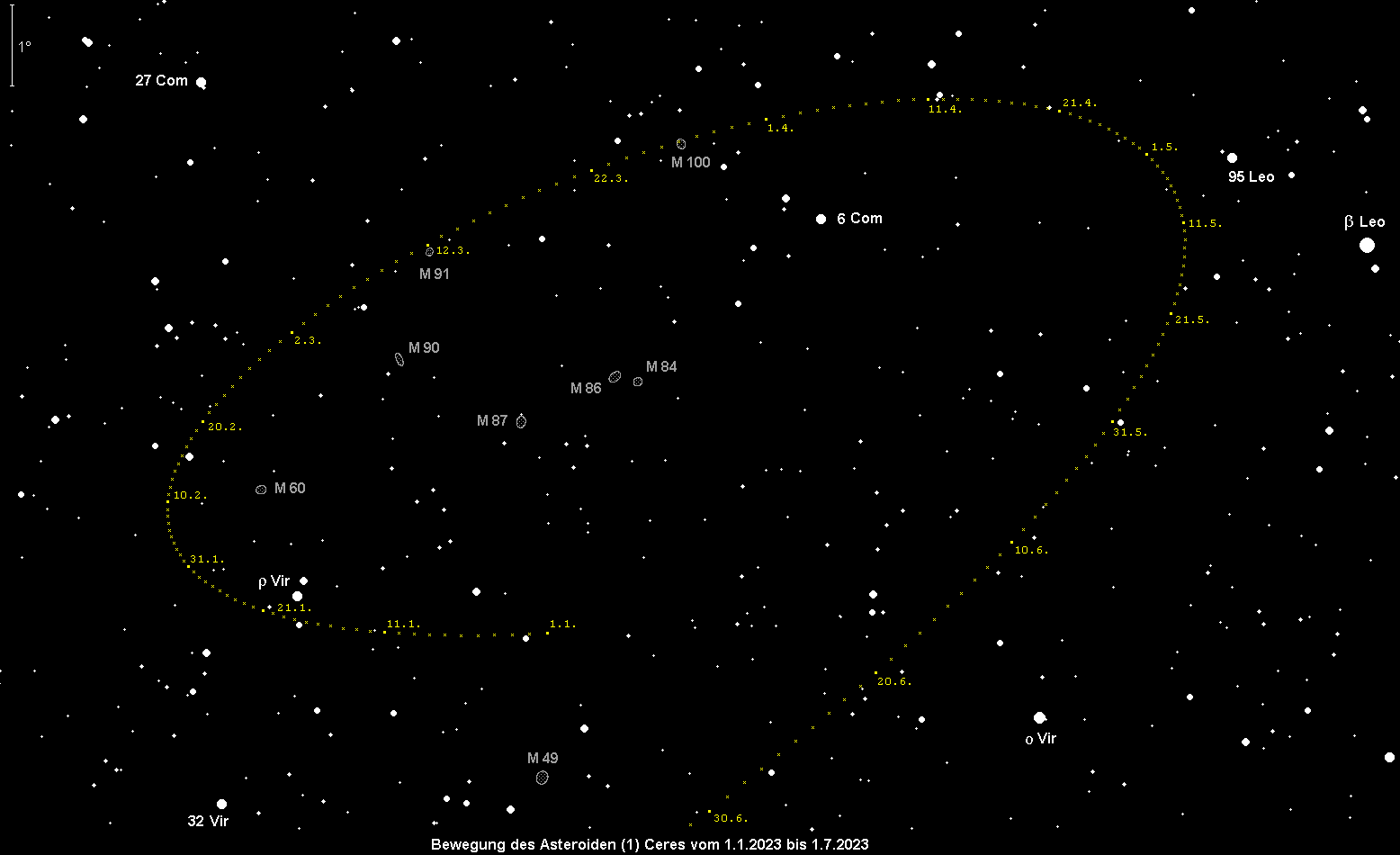 wird zum schwierigen Fernglasobjekt und beendet zum Monatsende ihre Sichtbarkeit. Kleinplanet Nr. 1 bewegt sich rechtläufig in südöstlicher Richtung durch das Sternbild Jungfrau. Ihre Helligkeit sinkt von 8.2m auf 8.6m ab. Die beste Beobachtungszeit ergibt sich gleich zu Dämmerungsende.