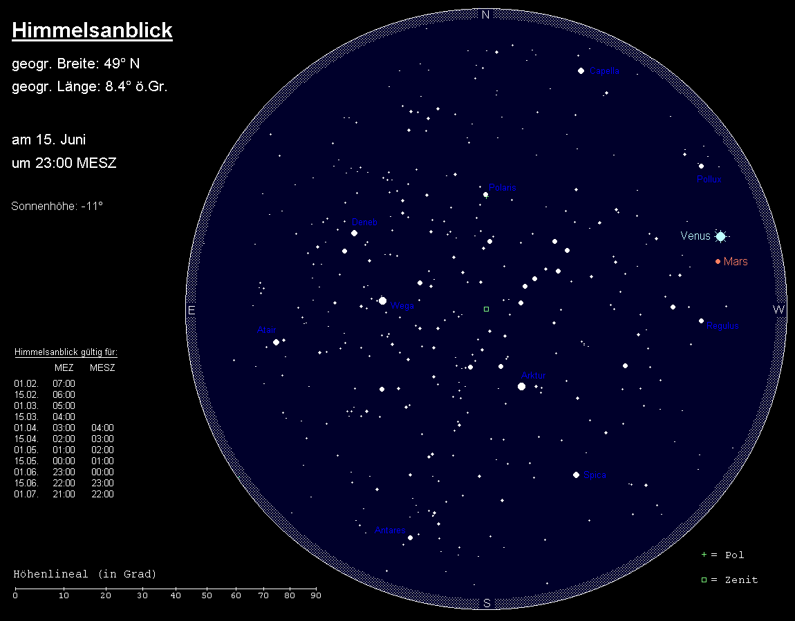 ist bis spät am Abend ein Hingucker über dem WNW-Horizont. Ihre Horizonthöhen nehmen im Monatsverlauf aber deutlich ab. Der Untergang erfolgt zu Monatsbeginn gegen 0:30 MESZ, am Monatsende bereits gegen 23:30 MESZ. Ihre Helligkeit steigt von –4.4m auf –4.7m an. Damit kann sie auch am Taghimmel mit dem bloßen Auge gesichtet werden, sofern ihre Position genau bekannt ist, wozu ein Fernglas hilfreich ist. Venus läuft anfangs noch durch das Sternbild Zwillinge, tritt am 3. Juni in das Sternbild Krebs und am 27. Juni bereits in das Sternbild Löwe. Dabei nähert sie sich zunehmend Mars, den sie aber nicht erreichen wird. Zum Monatsende beträgt der Abstand zwischen beiden Planeten weniger als 4°. Am 4. Juni erreicht Venus mit 45.4° die größte östliche Elongation von der Sonne. Am 13. Juni streift Venus den Nordrand des Sternhaufens der Praesepe (M 44). Am Abend des 21. Juni befindet sich die Mondsichel 4° rechts oberhalb der Venus, wobei Mars nur 4.5° von Venus entfernt steht. An diesem Tag hilft die Mondsichel bei einer Tagessichtung! Im Teleskop zeigt Venus am 4. Juni Halbphase und wird danach zur breiten Sichel. Der Durchmesser des Venusscheibchens wächst von 22.6“ auf 33.5“ an, während der Beleuchtungsgrad von 52% auf 32% zurückgeht.