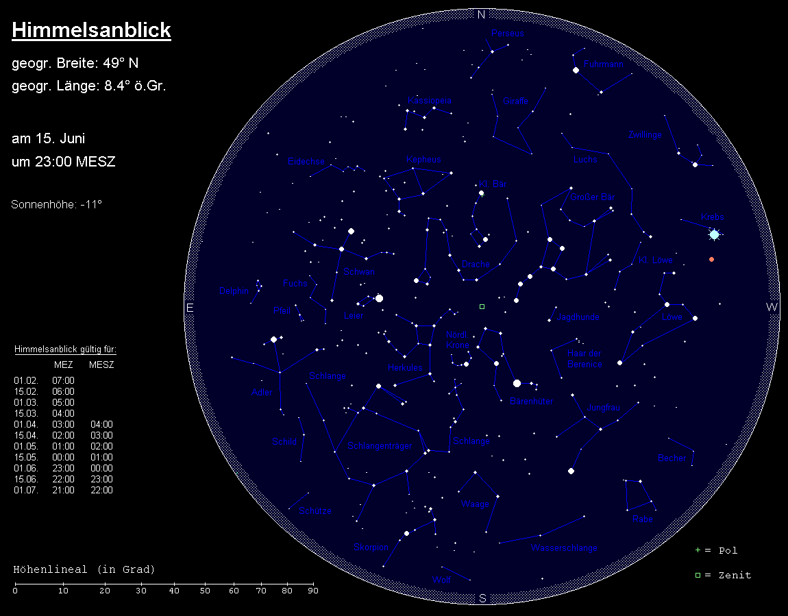 In den letzten drei Juniwochen endet die astronomische Dämmerung in Karlsruhe nicht. Zur Standardbeobachtungszeit (24:00 MESZ zu Monatsbeginn, 23:00 MESZ zur Monatsmitte und 22:00 MESZ am Monatsende) ist die Dämmerung daher nicht abgeschlossen, ja in der zweiten Junihälfte herrscht zu dieser Zeit noch helle Dämmerung, so dass schwächere Objekte entsprechend später beobachtet werden müssen. Aus Gründen der Einheitlichkeit in Bezug auf die übrigen Monate wird der Himmelsanblick aber zu jeweils den gleichen Uhrzeiten dargestellt.