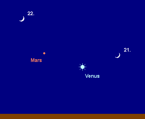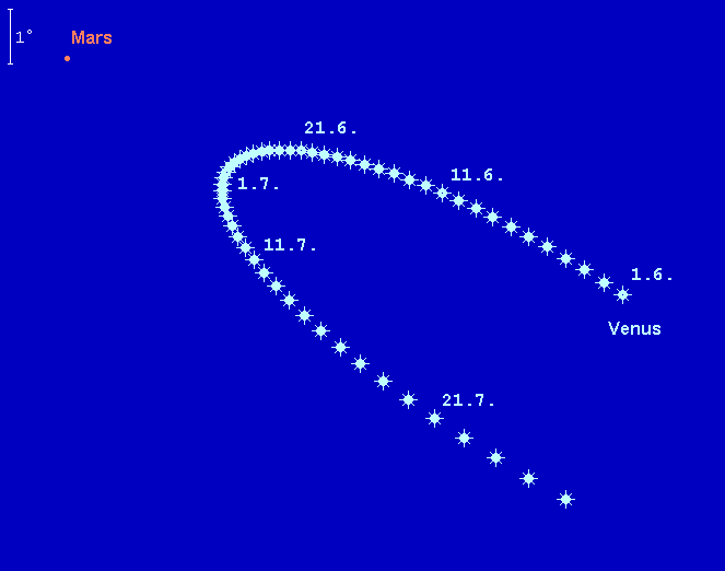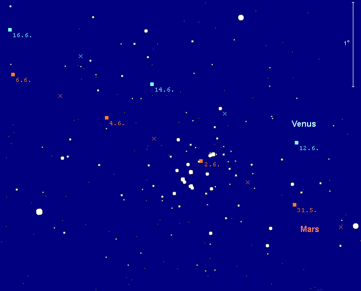 ist kein auffälliges Objekt am Abendhimmel mehr. Er kann links oberhalb der hellen Venus aufgefunden werden, die sich ihm immer mehr nähert. Der am Monatsende nur noch 1.7m helle Planet wandert durch den Krebs und erreicht am 20. Juni das Sternbild Löwe. Vom 1. bis zum 3. Juni wandert er durch den Sternhaufen Praesepe (M 44), wobei er an dessen Zentrum knapp nördlich vorüberläuft. Der Marsuntergang verlagert sich im Monatsverlauf von 1:00 MESZ auf 23:45 MESZ. Am Abend des 22. Juni steht die Mondsichel 4.5° links oberhalb des Roten Planeten.