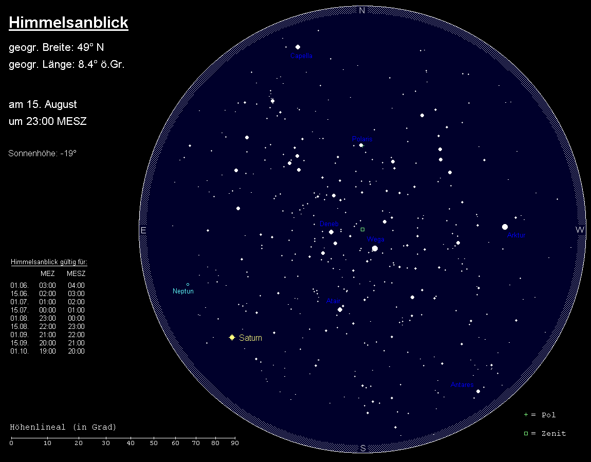 Im August ist zu den Standard-Beobachtungszeiten (24:00 MESZ zu Monatsbeginn, 23:00 MESZ zur Monatsmitte und 22:00 MESZ am Monatsende) die astronomische Dämmerung bereits beendet und somit der Sternenhimmel in seiner ganzen Pracht beobachtbar.