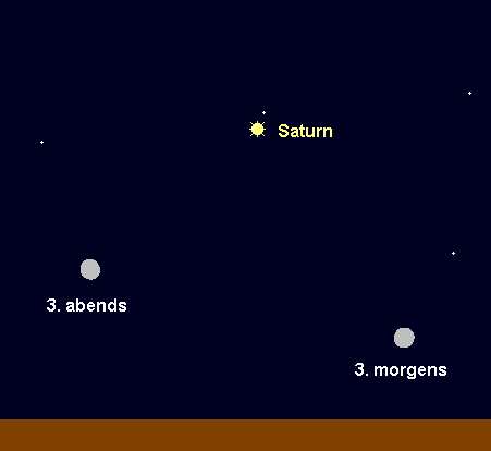 wird am 29. August stationär und wandert anschließend rückläufig durch den südöstlichen Teil des Sternbilds Widder, der keine auffälligen Sterne beheimatet. Dafür kann Jupiter als Orientierung dienen, der sich dem grünlichen Planeten zum Monatsende bis auf 7.5° angenähert hat. Näher kommen sich die beiden Planeten in diesem Jahr nicht mehr. Der 5.7m helle Planet geht zu Monatsbeginn um 0:30 MESZ auf, am Monatsende um 22:30 MESZ. Eine Stunde später kann man Uranus im Fernglas sicher ausmachen. Am Morgen des 9. August ist der abnehmende Mond eine gute Aufsuchhilfe. Er steht um 3:00 MESZ nur 1.8° links oberhalb von Uranus.