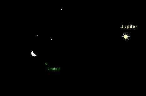bewegt sich rückläufig im Sternbild Fische, nahe der Grenze zum Sternbild Wassermann. Er nähert sich dem 5.5m hellen Stern 20 Psc, der eine Orientierungshilfe in der recht sternarmen Region sein kann. Der 7.8m helle Planet geht stetig früher auf. Erscheint er zu Monatsbeginn gegen 22:45 MESZ über der Horizontlinie, so geht er zu Monatsende bereits um 20:45 MESZ auf. Die Kulmination verlagert sich von 4:30 MESZ auf 2:30 MESZ. Zu Monatsbeginn und -ende befindet sich der noch fast volle Mond in der Nähe und dürfte Beobachtungen deutlich erschweren.