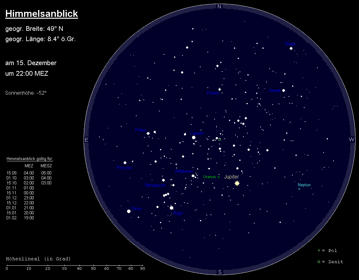 ist ein Objekt des Abendhimmels. Der 7.9m helle Planet bewegt sich rechtläufig zunächst im Sternbild Wassermann, verlässt dieses aber am 11. Dezember für die nächsten 155 Jahre in Richtung des Sternbilds Fische. Den Meridian passiert er anfangs um 19:30 MEZ, am Monatsende aber bereits um 17:30 MEZ, wenn die Dämmerung noch nicht zu Ende ist. Die Untergänge verlagern sich von 1:00 MEZ auf 23:00 MEZ, wobei er etwa zwei Stunden zuvor im horizontnahen Dunst unsichtbar wird. Der halbbeleuchtete Mond passiert Neptun am 19. Dezember im Abstand von lediglich 2°, dürfte somit Beobachtungen erschweren. Im Teleskop zeigt der fernste Planet bei Vergrößerungen von mehr als 200x sein winziges blaugrünes Scheibchen. Maximal 15“ von diesem entfernt kann der größte Mond Triton (13.4m) ausgemacht werden.