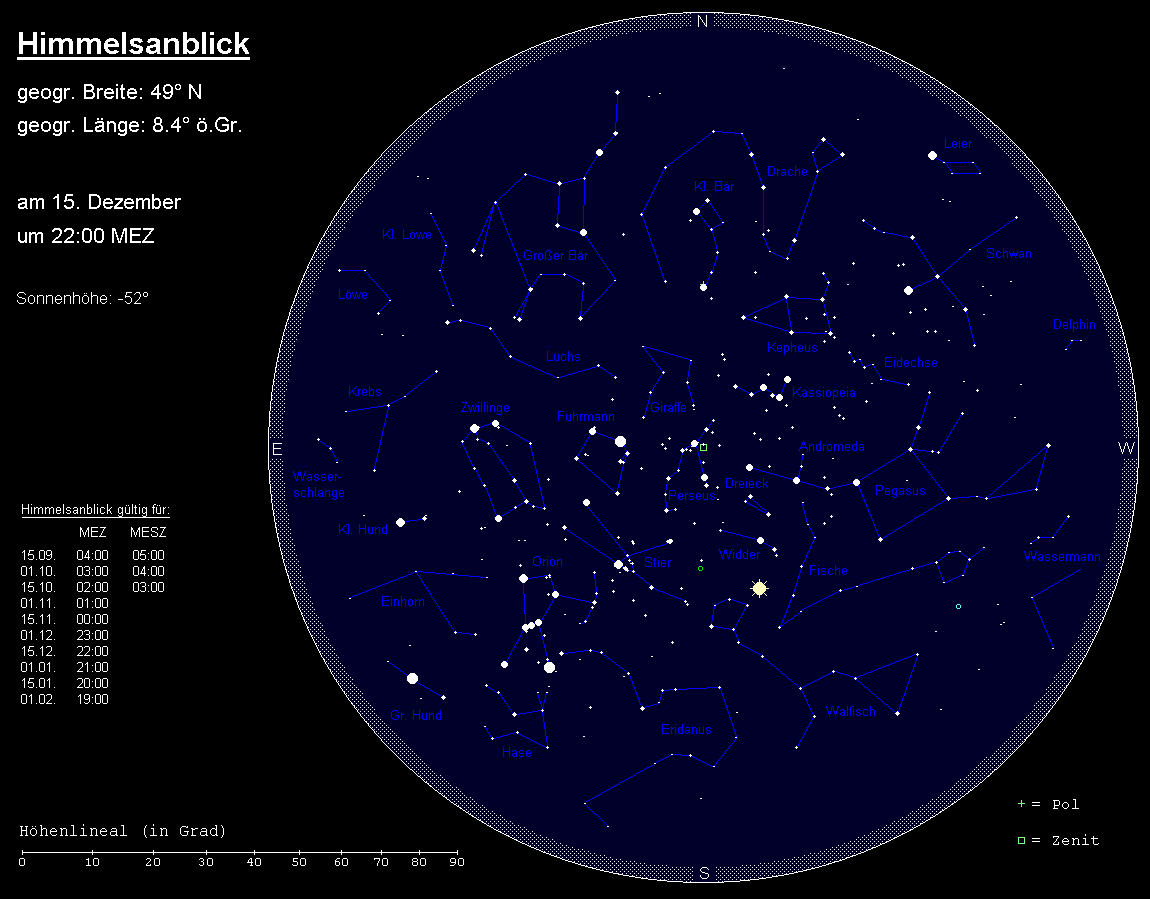 Im Südwesten geht das Sternbild Wassermann unter. Ein Großteil des Südwesthimmels nimmt das Sternbild Walfisch ein, welches nicht einfach auszumachen ist. Im Süden kulminiert das noch schwieriger zu identifizierende ausgedehnte Sternbild Eridanus, das sich von Rigel im Orion in einem weiten Bogen zunächst nach Westen und dann nach Süden zieht und dessen hellster Stern Achernar von uns aus gesehen nie über den Horizont steigt. Über unseren Köpfen – genau im Zenit – steht das Sternbild Perseus und östlich davon das Sternbild Fuhrmann mit der hellen Capella. Südlich dieser beiden Sternbilder erstreckt sich der Stier mit dem orangefarbenen Aldebaran und den zwei Sternhaufen Hyaden (um Aldebaran) und Plejaden (rechts oberhalb von Aldebaran).