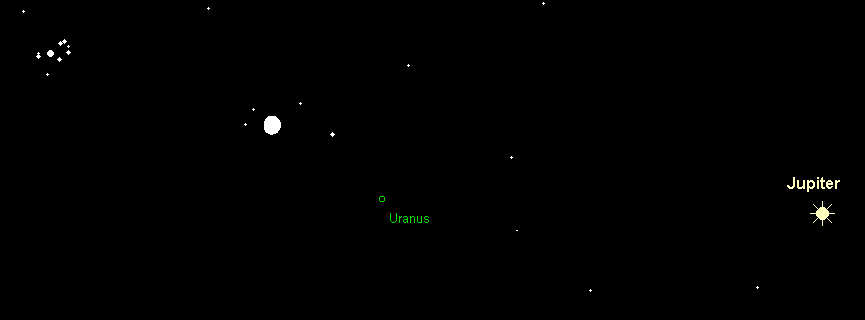 stand Mitte November in Opposition zur Sonne und kann im Dezember optimal beobachtet werden. Der 5.6m helle Planet wandert rückläufig durch den Südostteil des Sternbilds Widder. Als Startpunkt kann weiter Jupiter dienen, der sich 14° westlich von Uranus befindet. Unter sehr guten Bedingungen kann man versuchen, Uranus mit dem bloßen Auge zu erspähen. Die Meridianpassage verlagert sich im Monatsverlauf von 22:45 MEZ auf 20:45 MEZ, der Untergang von 6:15 MEZ auf 4:15 MEZ, wobei der Planet etwa eine Stunde zuvor im Horizontdunst unsichtbar wird. Am frühen Abend des 23. Dezember findet man den Mond 2.5° links oberhalb des Planeten. Im Teleskop zeigt sich ab 100x Uranus‘ grünliches Scheibchen deutlich; Einzelheiten können aber keine entdeckt werden. Mit größeren Instrumenten können die Monde Titania (13.9m) und Oberon (14.1m) im Abstand von maximal 30“ bzw. 40“ ausgemacht werden.