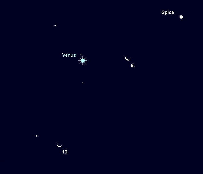 ist weiterhin das strahlende Objekt des Morgenhimmels. Sie wandert zunächst durch das Sternbild Jungfrau, wobei sie sich von Spica entfernt, tritt aber am 10. Dezember in das Sternbild Waage und bereits am letzten Tag des Jahres ins Sternbild Skorpion. Am 17. Dezember findet man sie 2° nördlich des Doppelsterns alpha Lib. Venus wandert somit in immer südlichere Regionen, weshalb ihre Horizonthöhen merklich abnehmen. Die Helligkeit geht im Monatsverlauf von –4.2m auf –4.0m zurück. Die Aufgänge verlagern sich von 4:00 MEZ auf 5:15 MEZ, womit noch immer ausreichend Beobachtungszeit verbleibt. Am frühen Abend des 9. Dezember passiert der Mond den Planeten südlich. Daher findet man die Mondsichel am Morgen des 9. Dezember 5° rechts und am Morgen des 10. Dezember 9° unterhalb des Morgensterns. Im Teleskop wird die Venus stetig uninteressanter. Im Monatsverlauf schrumpft der Scheibchendurchmesser von 17“ auf 14“, während der Beleuchtungsgrad von 68% auf 78% zunimmt.