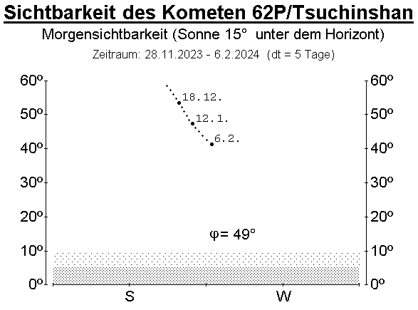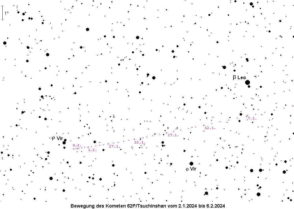Der Komet 62P/Tsuchinshan wird sein Perihel am 1. Weihnachtsfeiertag passieren und sollte dann 8-9m hell sein. Er bewegt sich im Dezember und Januar durch die Sternbilder Löwe und Jungfrau und kann damit gut am Morgenhimmel beobachtet werden. Details entnehme man dem AVKa-Beobachterinfo Nr. 13.