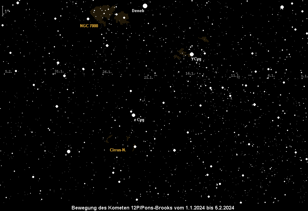 Am Abendhimmel präsentiert sich der Komet 12P/Pons-Brooks, der im Verlauf des Monats in östlicher Richtung durch das Sternbild Schwan zieht und seine Helligkeit von 8.5m auf 7.0m steigern dürfte, wobei er weiterhin Ausbrüche zeigt. Seine Horizonthöhen nehmen langsam ab, so dass man ihn gleich nach Dämmerungsende aufsuchen sollte. Eine Aufsuchkarte mit Sternen bis 8.5m findet sich hier.
