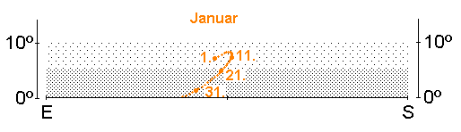 Der Helligkeitsschwerpunkt befindet sich im Januar im Süden. Halbhoch steht hier das auffälligste Wintersternbild, der Orion mit der orangefarbenen Beteigeuze und dem blauen Rigel sowie dem im Fernglas gut erkennbaren Orionnebel südlich der Gürtelsterne. Oberhalb finden wir das Sternbild Stier mit dem orangefarbenen Aldebaran und seinen zwei Sternhaufen Hyaden (um Aldebaran) und Plejaden (nordwestlich von Aldebaran), auch Siebengestirn genannt. Und über unseren Köpfen, im Zenit, steht die helle Capella, Hauptstern des Sternbilds Fuhrmann. Nordöstlich des Orions befindet sich das Sternbild Zwillinge mit Castor und Pollux und unterhalb der Zwillinge das Sternbild Kleiner Hund mit dem hellen Procyon. Südöstlich des Orions strahlt Sirius im Sternbild Großer Hund, der hellste Stern am irdischen Himmel. Das Wintersechseck, gebildet aus den Sternen Capella, Pollux, Procyon, Sirius, Rigel und Aldebaran, zieht somit im Süden alle Blicke auf sich.