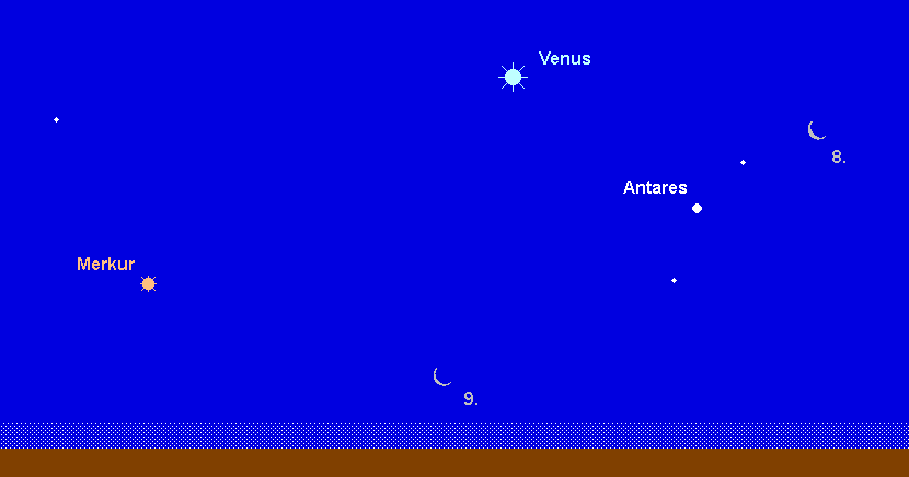 kann ab dem Neujahrstag am Morgenhimmel beobachtet werden, nicht allzu weit von der strahlenden Venus entfernt. Gegen 7:30 MEZ findet man den 0.5m hellen Planeten tief über dem Südosthorizont. Am 2. Januar wird er stationär und läuft anschließend rechtläufig zunächst durch das Sternbild Schlangenträger, ab dem 12. Januar durch das Sternbild Schütze. Am 7. Januar erreicht der dann –0.2m helle Planet seine größte Horizonthöhe, die bei dieser Sichtbarkeit aber bescheiden ausfällt. Die schmale Mondsichel kann am Morgen des 9. Januar bei der Identifikation behilflich sein; sie steht allerdings immerhin 9° rechts unterhalb von Merkur. Am 12. Januar steht der flinke Planet in größter westlicher Elongation mit 24°. In der Folge nehmen die Horizonthöhen kontinuierlich ab. Letztmals dürfte man den noch immer –0.2m hellen Planeten um den 22. Januar sichten können, wobei die beste Beobachtungszeit noch immer gegen 7:30 MEZ eintritt.