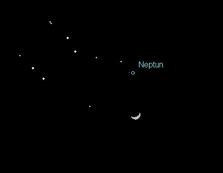 kann im Januar noch leidlich gut mit dem Fernglas gesichtet werden. Der 7.9m helle fernste Großplanet bewegt sich durch den westlichen Teil des Sternbilds Fische, unweit der Grenze zum Sternbild Wassermann. Die beste Beobachtungszeit ergibt sich gleich nach dem Ende der Dämmerung. Die Untergänge des Neptuns verlagern sich von 23:00 MEZ auf 21:00 MEZ, doch wird der Planet etwa zwei Stunden zuvor in den horizontnahen Dunstschichten unsichtbar. Am Abend des 15. Januar passiert der Mond Neptun, wobei er 2.5° unterhalb des fernsten Großplaneten positioniert ist. Teleskopische Beobachtungen können aufgrund der geringen Horizonthöhen nicht mehr sinnvoll durchgeführt werden.