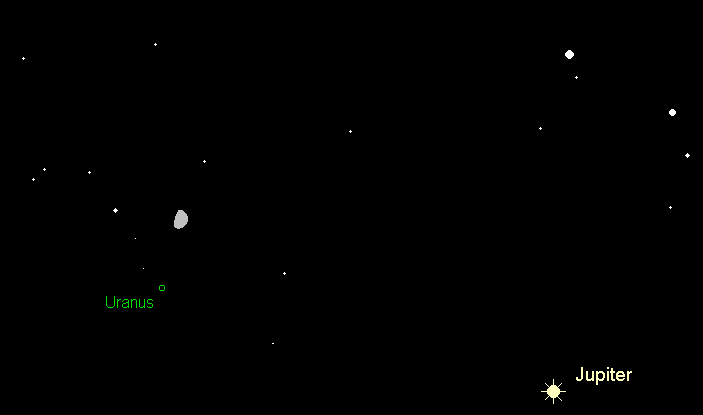 wird am 27. Januar stationär und bewegt sich anschließend wieder rechtläufig durch das Sternbild Widder, wobei er etwa 13° östlich Jupiters steht. Der 5.7m helle Planet verlagert seine Untergänge von 4:00 MEZ auf 2:00 MEZ, doch wird er etwa eine Stunde zuvor unsichtbar. Die Meridianpassage (beste Beobachtungszeit) verschiebt sich von 20:45 MEZ auf 18:45 MEZ. Den Mond findet man am Abend des 19. Januars 2° oberhalb des grünlichen Planeten. Im Teleskop zeigt sich das 3.7“ große Uranusscheibchen ab etwa 100-facher Vergrößerung deutlich. Besitzer mittelgroßer Instrumente können sich auch an den größten Uranusmonden Titania (13.8m) und Oberon (14.1m) versuchen, die sich nie weiter als etwa 30“ bzw. 40“ vom Planetenscheibchen entfernen.
