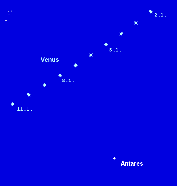 beginnt das Jahr als strahlender Morgenstern, verliert aber im Laufe des Monats deutlich an Höhe. Der –4.0m helle Planet bewegt sich vom Sternbild Skorpion bis in das Sternbild Schütze. Ihre Aufgänge verlagern sich im Monatsverlauf von 5:15 MEZ auf 6:15 MEZ. Am 6. Januar passiert der strahlende Planet Antares, den Hauptstern des Sternbilds Skorpion, in 6° nördlichem Abstand. Der Mond passiert die Venus am Morgen des 9. Januars, wobei er fast 9° unterhalb des Planeten steht (am vorangehenden Morgen steht er 9° rechts der Venus). Im Teleskop zeigt die Venus ein kleines, nahezu rundes Scheibchen, dessen Durchmesser von 14“ auf 12“ zurückgeht, während der Beleuchtungsgrad von 78% auf 86% anwächst.