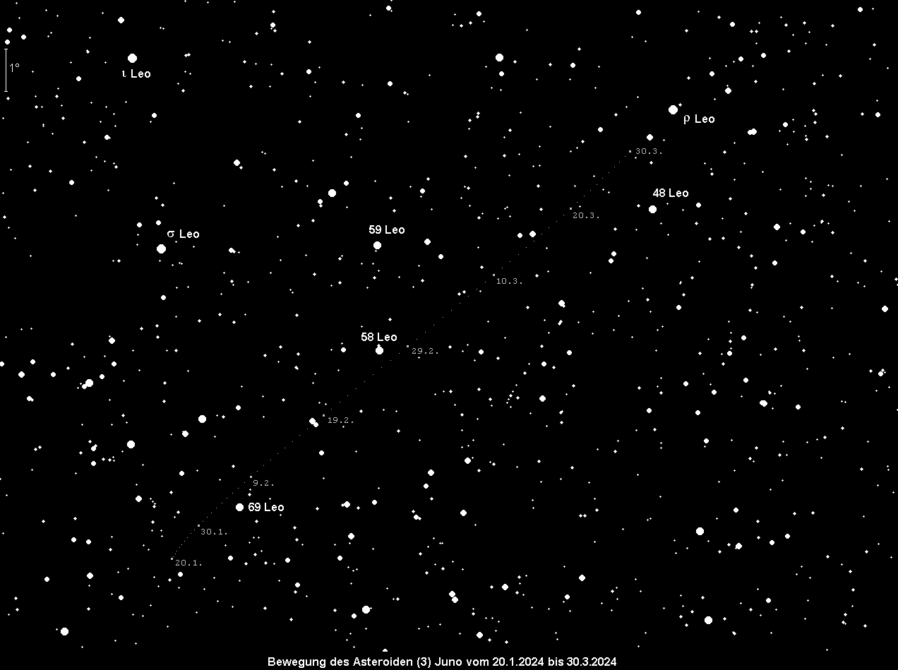 bewegt sich rückläufig durch den südöstlichen Teil des Sternbilds Löwe. Im Monatsverlauf steigert Kleinplanet Nr. 3 ihre Helligkeit von 9.2m auf 8.8m, womit sie in einem guten Fernglas erkennbar ist. Die beste Beobachtungsmöglichkeit ergibt sich in der Zeit um die Kulmination. Diese erfolgt zu Monatsbeginn um 3:00 MEZ, am Monatsende um 1:00 MEZ. Allerdings kann man auch bereits am späteren Abend nach Juno suchen.