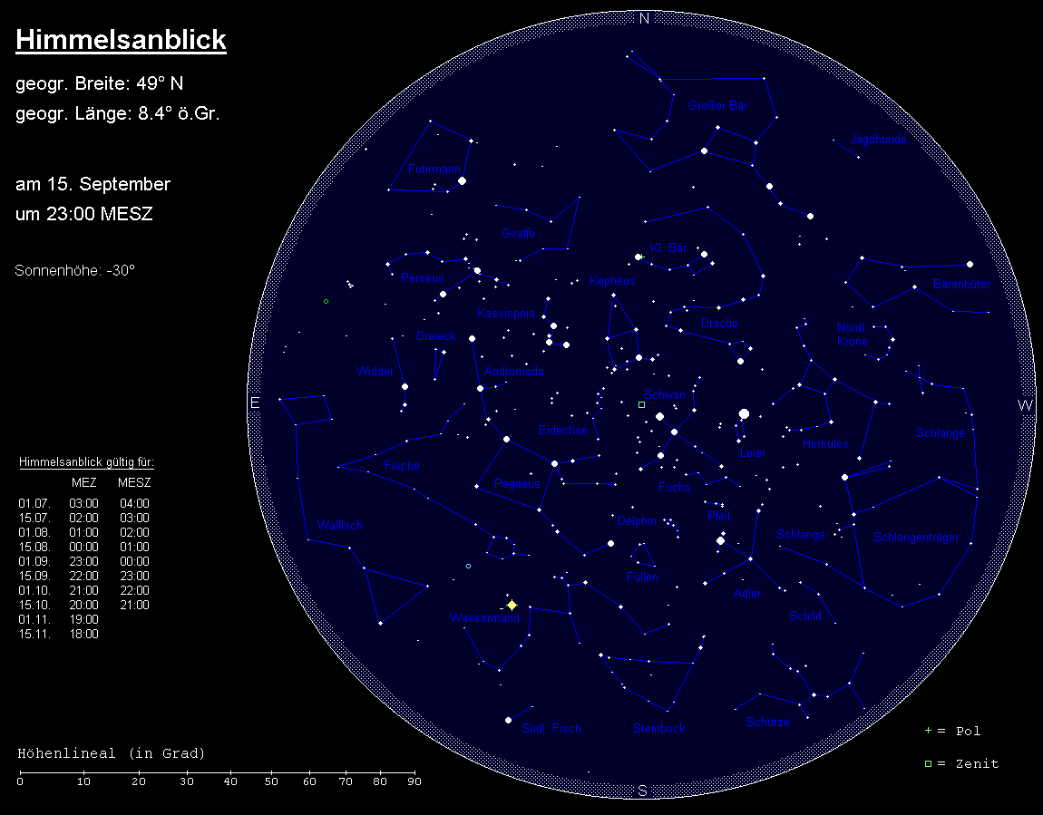 Über dem Südosthorizont stehen die ausgedehnten Sternbilder Wassermann und Walfisch, wobei letzterer noch so tief steht, dass er kaum auffällt. Oberhalb dieser beiden Sternbilder zeigt sich das Sternbild Fische, welches nur aus Sternen 3. und 4. Größe besteht und daher nur unter dunklem Himmel gut erkennbar ist. Lediglich der Kopf des westlichen Fischs fällt ein wenig auf. Das dominierende Sternbild im Südosten ist der Pegasus, auch Herbstviereck genannt. Östlich schließt sich die Sternenkette des Sternbilds Andromeda an. Am Ende der kurzen, nach Norden weisenden Sternenkette innerhalb der Andromeda finden wir den berühmten Andromedanebel, unsere Nachbargalaxie. Unterhalb der Andromeda sind die Sternbilder Dreieck und Widder beheimatet. Das unscheinbare Sternbild Eidechse findet sich östlich des Meridians in Zenitnähe.