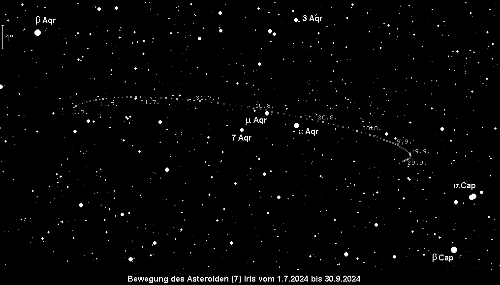 wandert zunächst rückläufig durch das Sternbild Steinbock, wird aber am 21. September stationär. Kleinplanet Nr. 7 wird stetig schwächer. Weist er Anfang September noch eine Helligkeit von 8.5m auf, so ist er Ende September nur noch 9.1m hell, womit er bei seiner südlichen Position im Fernglas unbeobachtbar wird. Die beste Möglichkeit, Iris im Fernglas zu erkennen ergibt sich um die Zeit der Kulmination. Diese findet Anfang September gegen 23:30 MESZ, Ende September gegen 21:15 MESZ statt.