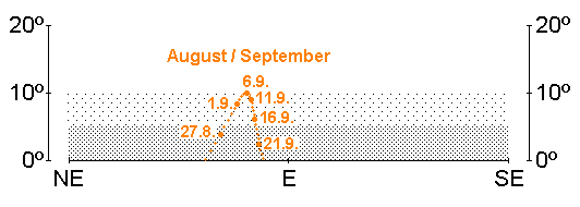 Die Sommermilchstraße steigt im Südwesten (Sternbild Schütze) über den Horizont und zieht sich dann über die Sternbilder Schild (mit der hellen Schildwolke), Adler und Schwan (mit auffälligen Partien) bis in den Zenit, um danach über Kassiopeia, Perseus und Fuhrmann zum Nordosthorizont abzusinken.