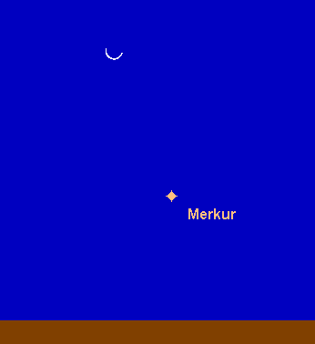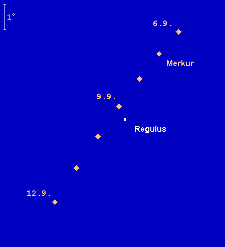 ist in der ersten Monatshälfte ein am Morgenhimmel gut erkennbares Objekt. Am 1. September findet man die schmale Mondsichel knapp 6° oberhalb des flinken Planeten. An diesem Tag überschreitet der 0.4m helle Planet um 05:05 MESZ die östliche Horizontlinie und ist gegen 05:45 MESZ am besten erkennbar. Am 5. September erreicht der dann bereits –0.4m helle Merkur mit 18° seine größte westliche Elongation und zwei Tage später die größte Horizonthöhe. Merkur bewegt sich durch das Sternbild Löwe und passiert am 9. September den Hauptstern Regulus in nur 0.5° nördlichem Abstand. In den folgenden zehn Tagen sinkt der Planet dann immer rascher dem Horizont entgegen. Am 20. September kann der –1.3m helle Planet gegen 06:45 MESZ wohl letztmals in der hellen Dämmerung knapp über dem Horizont ausgemacht werden. Bereits am 30. September steht er in oberer Konjunktion mit der Sonne. Im Teleskop ist am Monatsersten eine 8“ kleine Sichel erkennbar, am 6. September ist das 7“ messende Scheibchen halb beleuchtet und in den folgenden Tagen nimmt der Beleuchtungsgrad weiter zu, der Durchmesser aber ab. Aufgrund der geringen Horizonthöhe mit damit verbundener großer Luftunruhe ist es bereits ein Erfolg, die Phasengestalt überhaupt ausmachen zu können.
