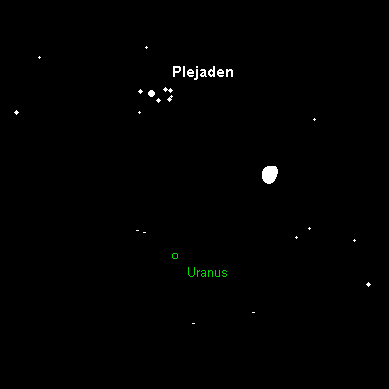 wird am 1. September stationär und bewegt sich anschließend rückläufig durch das Sternbild Stier, unweit der Plejaden. Der 5.7m helle Planet geht zu Monatsbeginn gegen 22:45 MESZ, am Monatsende gegen 20:45 MESZ auf, kann aber erst etwa eine Stunde später im Fernglas ausgemacht werden. Der Mond steht am Morgen des 22. September 4° rechts oberhalb des grünlichen Planeten. Im Teleskop zeigt dieser ein 3.6“ messendes Scheibchen.