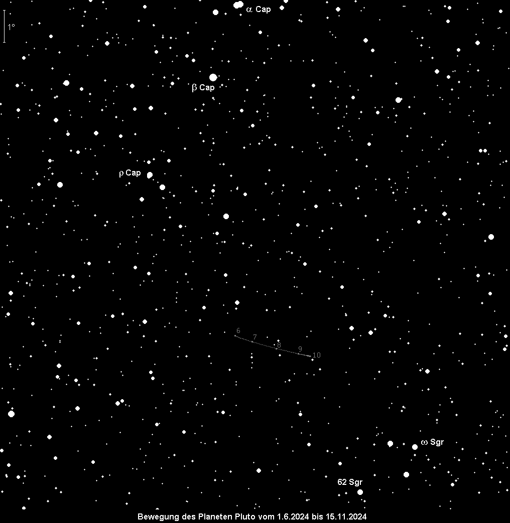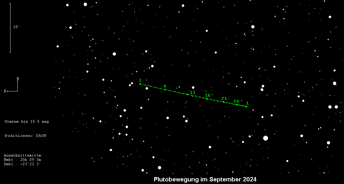 kann mit großen Instrumenten im September noch beobachtet werden. Allerdings steht der nur 14.4m helle Zwergplanet im Sternbild Steinbock, nahe der Grenze zum Sternbild Schütze, so dass er nur geringe Horizonthöhen erreicht. Am erfolgversprechendsten sind Beobachtungen mit Instrumenten ab 30cm Öffnung nahe der Kulmination, die zu Monatsbeginn gegen 23:00 MESZ, am Monatsende gegen 21:00 MESZ stattfindet. Die drei Aufsuchkarten sollen bei der Suche eine Hilfe sein.