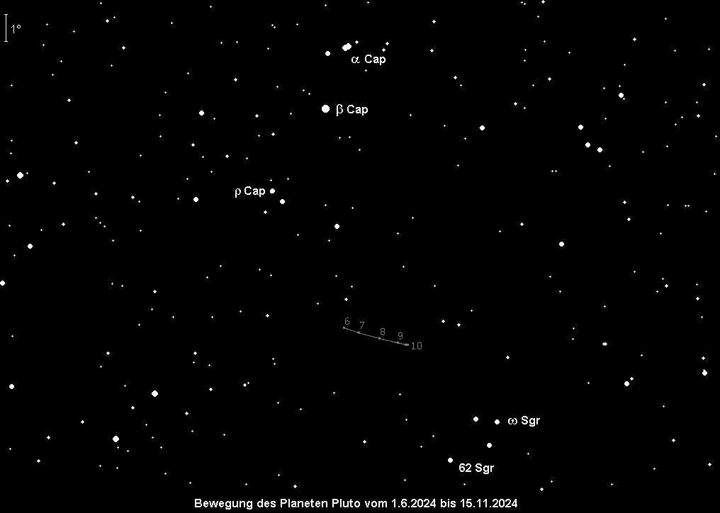 steht am 8. September in Opposition zur Sonne. Damit geht er bei Sonnenuntergang im Osten auf und zum Sonnenaufgang im Westen unter. Der rückläufig durch das Sternbild Wassermann wandernde Planet erreicht eine maximale Helligkeit von 0.6m. Der Vollmond passiert den Ringplaneten am Mittag des 17. Septembers. Am Morgen findet man ihn 5° rechts unterhalb, am Abend 5° links unterhalb von Saturn. Im Teleskop präsentiert der Planet ein ovales Scheibchen mit einem Äquatordurchmesser von 19.2“ und einem Poldurchmesser von 17.1“. Der Ring ist nur knapp 4° gegen die Blickrichtung zum Beobachter geneigt und weist eine Längenausdehnung von 43.6“ und einen Querdurchmesser von 2.9“ auf. Damit können aktuell weder die Cassinische Teilung noch andere Details im Ring erkannt werden. Mit kleineren Instrumenten können vier der fünf helleren Monde beobachtet werden, nämlich Tethys (10.2m), Dione (10.4m), Rhea (9.7m) und Titan (8.3m). Japetus befindet sich im September östlich des Ringplaneten und weist damit der Erde seine dunkle Seite zu. Mit größeren Instrumenten kann man versuchen, zusätzlich die deutlich schwierigeren Monde Enceladus (11.7m) und Hyperion (14.2m) auszumachen. Während ersterer Saturn noch innerhalb der Tethys-Bahn umläuft und somit immer nahe des Rings steht, läuft letzterer auf einer Bahn, die sich etwas außerhalb der Titan-Bahn befindet.