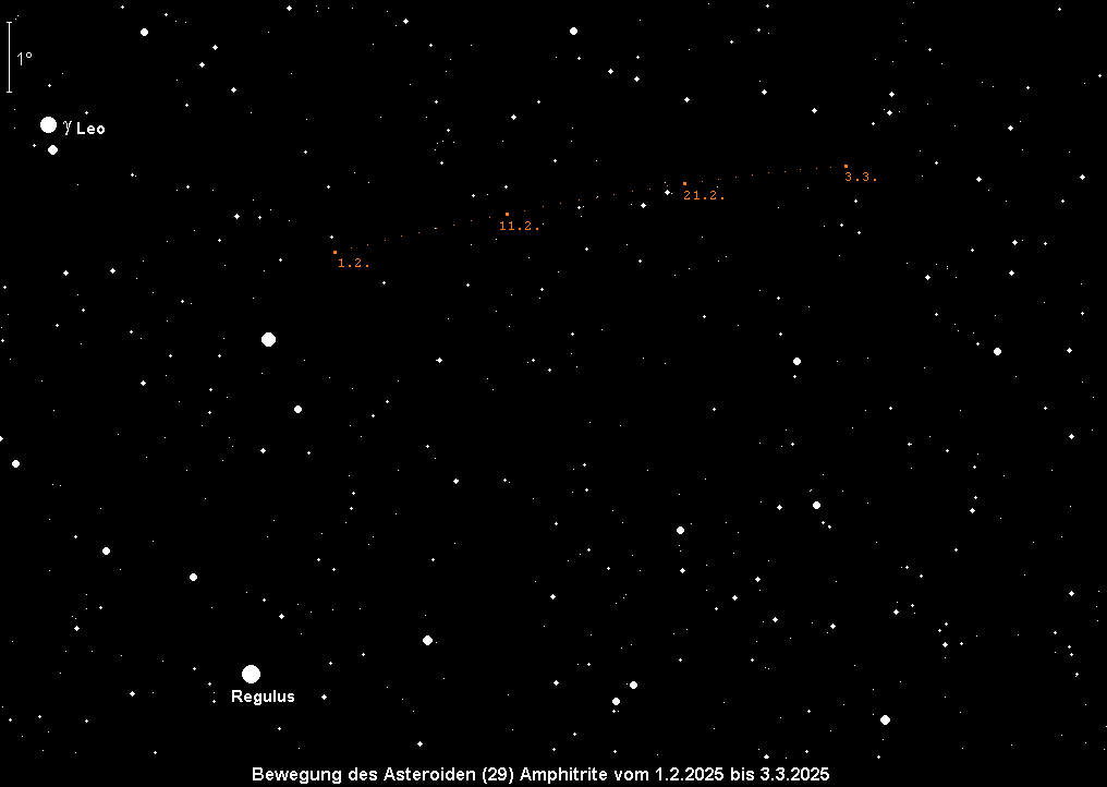 erreicht am 13. Februar ihre Opposition zur Sonne und ist dann 9.0m hell. Sie bewegt sich rückläufig durch den westlichen Bereich des Sternbilds Löwe. Zu Monatsbeginn ist Kleinplanet Nr. 29 erst 9.3m hell, am Monatsende bereits wieder 9.4m. Am erfolgreichsten ist eine Beobachtung zur Zeit der Kulmination. Diese ereignet sich zu Monatsbeginn um 1:45 MEZ, am Monatsende um 23:30 MEZ.