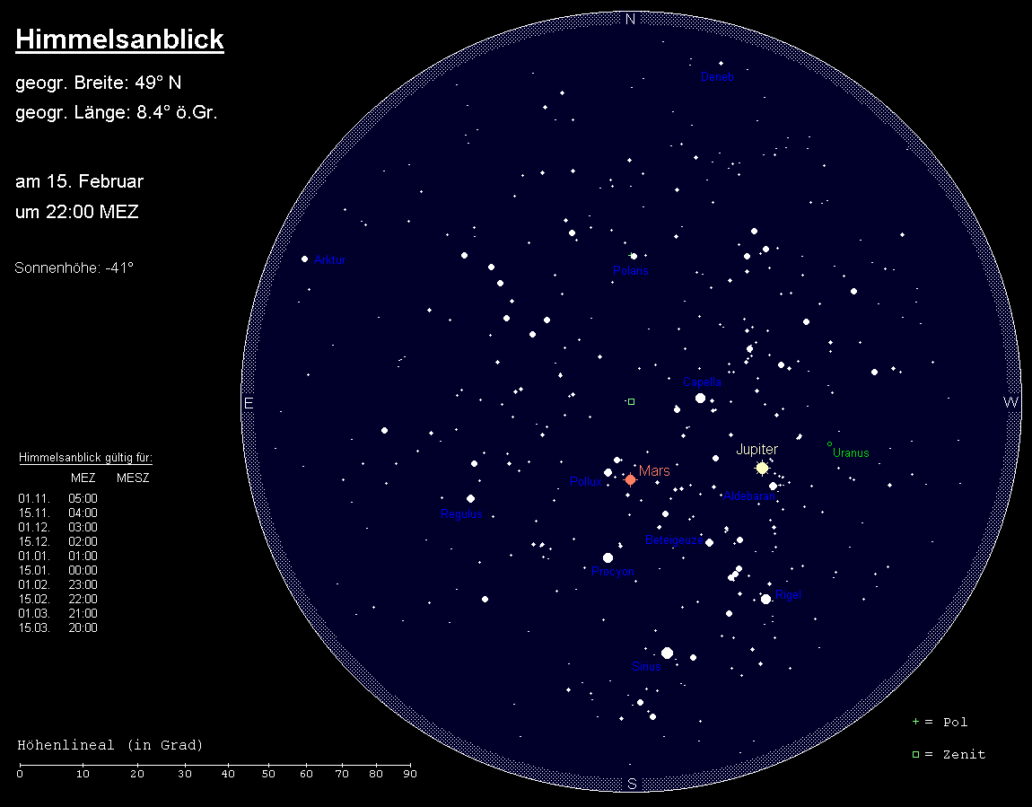 stand Mitte Januar in Opposition zur Sonne, ist im Februar aber weiter ein auffälliges Objekt der ganzen Nacht. Der Rote Planet bewegt sich zunächst noch rückläufig durch das Sternbild Zwillinge, wird aber am 24. Februar stationär und bewegt sich anschließend wieder in östlicher Richtung. Seine Helligkeit nimmt deutlich ab. Beträgt diese zu Monatsbeginn noch –1.2m, ist sie Ende Februar auf –0.3m gefallen. Durch den Meridian geht Mars zu Monatsbeginn um 23:00 MEZ, Ende Februar schon um 21:00 MEZ. Die Untergänge verlagern sich von 7:30 MEZ auf 5:30 MEZ. Der Mond kommt dem Roten Planeten am Abend des 9. Februar bis auf 0.4° nahe! Im Teleskop kann der Planet noch detailreich gesehen werden, auch wenn der Scheibchendurchmesser von 13.7“ auf 10.9“ zurückgeht. Insbesondere die nördliche Polkappe und die größeren Albedostrukturen sind erkennbar, wenn auch Letztere aufgrund des geringen Kontrastes etwas Geduld erfordern.