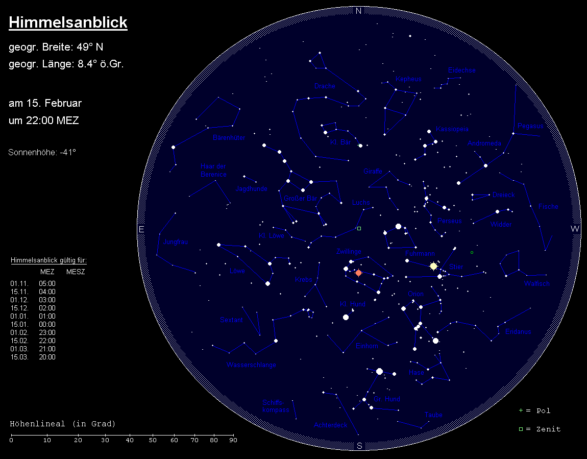 Im Südwesten ist der Walfisch größtenteils unter dem Horizont verschwunden, und das Sternbild Eridanus ist ebenfalls bereits zu größeren Teilen untergegangen.