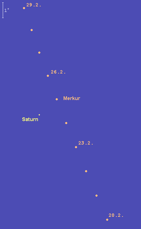 steht am 9. Februar in oberer Konjunktion mit der Sonne und entfernt sich in den folgenden Tagen in östlicher Richtung von ihr. Am 25. Februar kann der flinke Planet über dem westlichen Abendhorizont erstmals beobachtet werden, Spezialisten gelingt eine Erstsichtung eventuell schon am 20. Februar. Die beste Beobachtungszeit, den –1.3m hellen Planeten am 20. Februar zu finden, ergibt sich gegen 18:15 MEZ. Am letzten Februartag kann der dann –1.0m helle Merkur gegen 19:00 MEZ am besten beobachtet werden. Am Abend des 25. Februar kann man im Fernglas eventuell die Konjunktion mit dem deutlich schwächeren Saturn beobachten. Merkur steht an diesem Abend 1.5° rechts oberhalb des Ringplaneten.