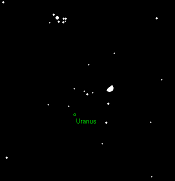 bewegt sich, unweit der Plejaden, langsam rechtläufig durch das Sternbild Widder und nähert sich der Grenze zum Sternbild Stier. Der 5.7m helle Planet verlagert seine Untergänge im Monatsverlauf von 2:45 MEZ auf 0:45 MEZ. Etwa eine Stunde zuvor wird er im Horizontdunst unsichtbar. Am Abend des 5. Januar findet man den Mond 4° rechts oberhalb des grünlichen Planeten. Im Teleskop präsentiert Uranus ein 3.6“ großes, grünliches Scheibchen, das ab etwa 100x erkennbar wird, auf dem aber keine Details auszumachen sind. Mit größeren Instrumenten können die zwei hellsten Monde Titania (13.9m) und Oberon (14.1m) in Abständen von 30“ bzw. 40“ ausgemacht werden.