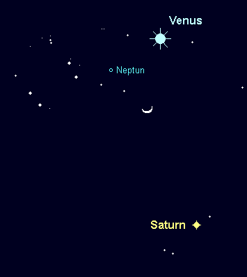 verabschiedet sich um den 20. Februar vom Abendhimmel. Der 8.0m helle Planet bewegt sich rechtläufig durch das Sternbild Fische, nahe der Grenze zum Wassermann. In den ersten Monatstagen kann die Venus als Aufsuchhilfe dienen. Neptun geht zu Monatsbeginn gegen 21:15 MEZ unter, am 20. Februar bereits um 20:00 MEZ. Eine Beobachtung muss gegen Sichtbarkeitsende bereits in der noch erkennbaren Dämmerung, kurz nach 19:00 MEZ, durchgeführt werden. Am Abend des 1. Februar findet man die schmale Mondsichel 2.5° rechts unterhalb des fernsten Planeten.