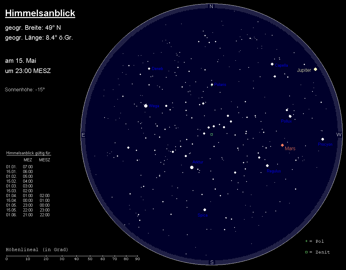 Zur Standardbeobachtungszeit (24:00 MESZ am Monatsanfang, 23:00 MESZ zur Monatsmitte und 22:00 MESZ am Monatsende) steht der Große Wagen über unseren Köpfen im Zenit. Er ist der auffälligste Teil des größeren Sternbilds Großer Bär. Unterhalb der Wagendeichsel leuchtet das nur aus zwei Sternen bestehende Sternbild Jagdhunde. In der fünffachen Verlängerung der vorderen Wagensterne stoßen wir auf den Polarstern, der stets genau im Norden steht. Er ist der hellste Stern des Sternbilds Kleiner Bär, das außer dem Polarstern noch zwei hellere Sterne aufweist, die nun fast ihre höchste Stellung erreicht haben. Der Gegenpart des Großen Bären, das Sternbild Kassiopeia oder Himmels-W, steht nun tief über dem Nordhorizont.