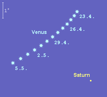 taucht in der ersten Maiwoche wieder am Morgenhimmel auf. Allerdings bleibt der Ringplanet während des gesamten Monats ein Objekt der Dämmerung. In den ersten Monatstagen kann man Venus zu Hilfe nehmen, die sich nach ihrer gemeinsamen Konjunktion am 29. April zunehmend von Saturn entfernt. Der 1.2m helle Saturn bewegt sich rechtläufig durch den westlichen Teil des Sternbilds Fische. Seine Aufgänge verlagern sich im Verlauf des Mai von 4:45 MESZ auf 3:00 MESZ. Am Morgen des 22. Mai findet man die breite Mondsichel 8° rechts von Saturn, am 23. Mai 7° links von diesem. Für teleskopische Beobachtungen steht der Ringplanet noch zu tief. Am 6. Mai wechselt die Sonne von der Nord- auf die Südseite der Ringe.