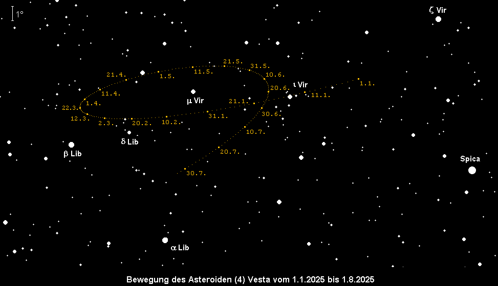 steht am 3. Mai im Sternbild Waage in Opposition zur Sonne. Dabei erreicht Kleinplanet Nr. 4 eine Helligkeit von 5.6m, womit er theoretisch mit bloßem Auge sichtbar ist – sofern die Bedingungen optimal sind. Eine wesentliche Bedingung hierfür ist die Horizonthöhe, weshalb um die Zeit der Kulmination beobachtet werden sollte. Diese verlagert sich im Monatsverlauf von 1:45 MESZ auf 23:15 MESZ. Am 7. Mai tritt die rückläufige Vesta ins Sternbild Jungfrau. Ihre Helligkeit nimmt bis Monatsende auf 6.0m ab.