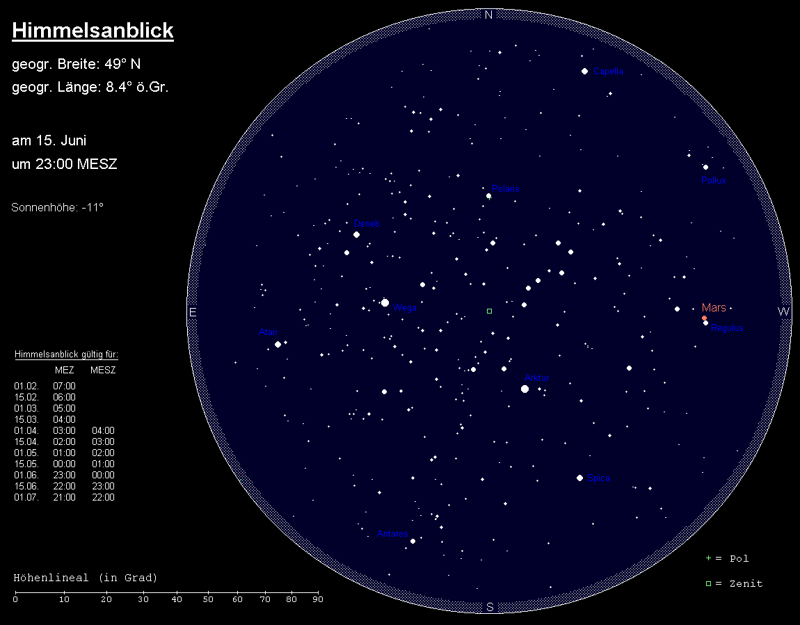 In den letzten drei Juniwochen endet die astronomische Dämmerung in Karlsruhe nicht. Zur Standardbeobachtungszeit (24:00 MESZ zu Monatsbeginn, 23:00 MESZ zur Monatsmitte und 22:00 MESZ am Monatsende) ist die Dämmerung daher nicht abgeschlossen, ja in der zweiten Junihälfte herrscht zu dieser Zeit noch helle Dämmerung, so dass schwächere Objekte entsprechend später beobachtet werden müssen. Aus Gründen der Einheitlichkeit in Bezug auf die übrigen Monate wird der Himmelsanblick aber zu jeweils den gleichen Uhrzeiten dargestellt.