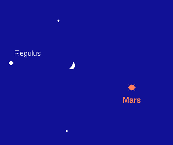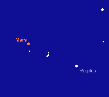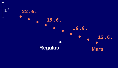 ist ein nicht länger auffälliges Objekt am Abendhimmel. Die Helligkeit des durch das Sternbild Löwe laufenden Roten Planeten sinkt von 1.3m auf 1.5m ab, seine Untergänge verfrühen sich von 1:45 MESZ auf 0:00 MESZ. Am Abend des 1. Juni passiert die zunehmende Mondsichel den Planeten und steht 4° links desselben. Diesen Monat erfolgt sogar eine zweite Mondpassage: am späten Abend des 29. Juni steht der Mond 2° rechts des Roten Planeten. Am 17. Juni passiert Mars den gleichhellen Regulus 0.8° nördlich. Im Teleskop können auf dem nur noch 5“ großen Planetenscheibchen keine Details mehr ausgemacht werden.