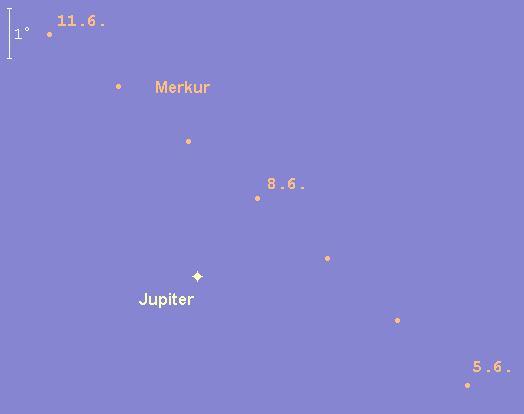 stand Mitte Mai in Konjunktion mit der Sonne. Aufgrund der flach zum Morgenhorizont liegenden Ekliptik kann der Planet im Juni noch nicht beobachtet werden.