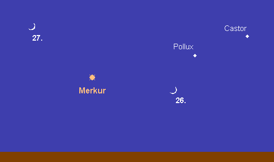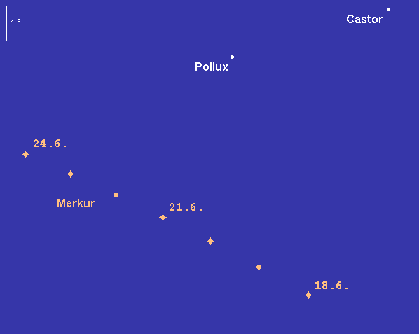 kann in der zweiten Junihälfte am Abendhimmel gesichtet werden, wobei gegebenenfalls ein Fernglas benutzt werden muss, da er nur geringe Horizonthöhen erreicht. Er bewegt sich anfangs im Sternbild Zwillinge, tritt aber am 25. Juni ins Sternbild Krebs. Spezialisten mögen ihn eventuell bereits am 8. Juni auffinden. An diesem Tag steht er 2° nördlich von Jupiter, der aber ebenfalls bereits kaum mehr sichtbar ist. Allgemein dürfte der dann –1.0m helle Planet um den 11. Juni tief über dem nordwestlichen Abendhorizont erstmals gesichtet werden können. Am besten sucht man gegen 22:15 MESZ nach ihm; sein Untergang erfolgt um 22:45 MESZ. Am einfachsten dürfte Merkur zwischen dem 16. und 22. Juni gegen 22:30 MESZ zu erkennen sein. In diesem Zeitraum sinkt seine Helligkeit lediglich von –0.5m auf –0.2m. Bis zum Monatsende sinkt sie auf 0.3m, während die beste Beobachtungszeit konstant bleibt. Insgesamt dürfte eine Sichtung zum Monatsende hin stetig schwieriger werden. Am 21. Juni findet man Merkur 5° unterhalb von Pollux. Am Abend des 26. Juni steht Merkur 6° links der schmalen Mondsichel und am Abend des 27. Juni 7° rechts unterhalb. Im Teleskop ist es bereits ein Erfolg, die Phase des Merkur überhaupt zu erkennen. Am 28. Juni zeigt der Planet die Halbphase des dann 7.3“ großen Scheibchens. Im Verlauf der Sichtbarkeit wird das Merkurscheibchen leicht größer, während der Beleuchtungsgrad zurückgeht.