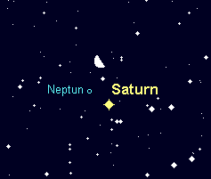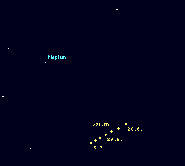 taucht Mitte Juni endlich am Morgenhimmel auf. Der 7.9m helle Planet bewegt sich rechtläufig durch den westlichen Teil des Sternbilds Fische, unweit von Saturn. Seine Bewegung ist kaum erkennbar, da er Anfang Juli stationär wird. Seine Aufgangszeiten entsprechen denen von Saturn, allerdings kann er erst etwa zwei Stunden nach dem Aufgang mit Aussicht auf Erfolg im Fernglas erkannt werden. Am 19. Juni kann die Mondsichel eventuell bei der Identifikation behilflich sein. Am 29. Juni passiert Saturn den fernsten Planeten 1.0° südlich.