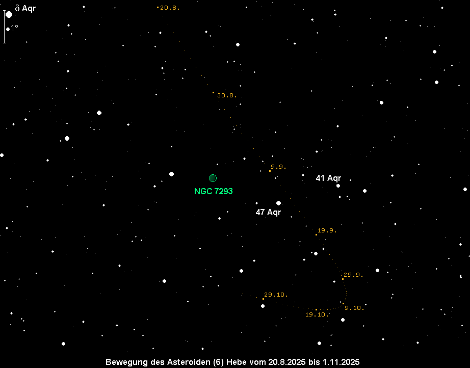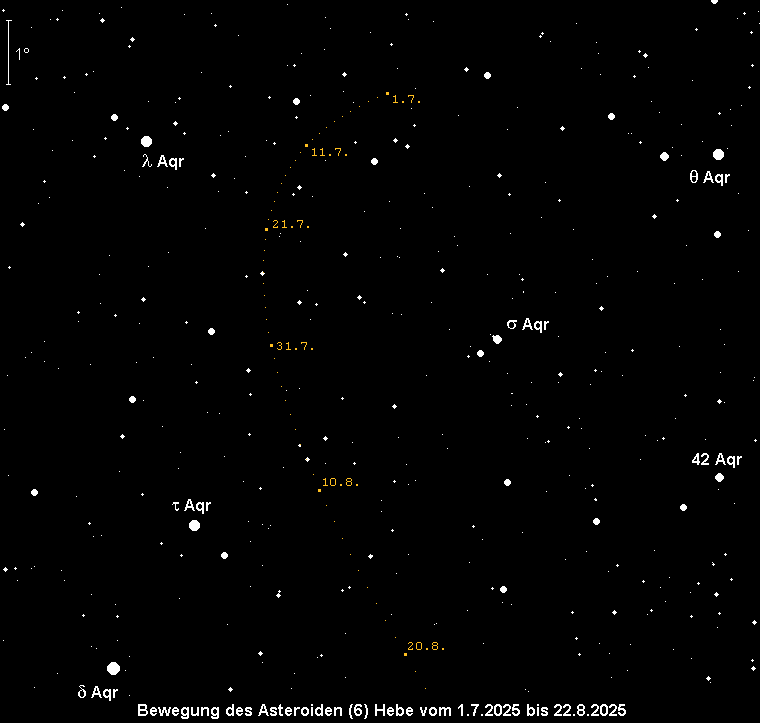 erreicht am 26. August ihre Opposition und wird dabei 7.6m hell. Zu Monatsbeginn beträgt die Helligkeit des Kleinplaneten Nr. 6 erst 8.3m. Sie bewegt sich in südwestlicher Richtung durch das Sternbild Wassermann, womit sie keine großen Horizonthöhen erreicht. Dennoch sollte sie zur Zeit der Kulmination unter einem dunklen Himmel in einem Fernglas erkennbar sein. Die Kulmination erfolgt zu Monatsbeginn um 3:30 MESZ, am Monatsende um 1:15 MESZ.