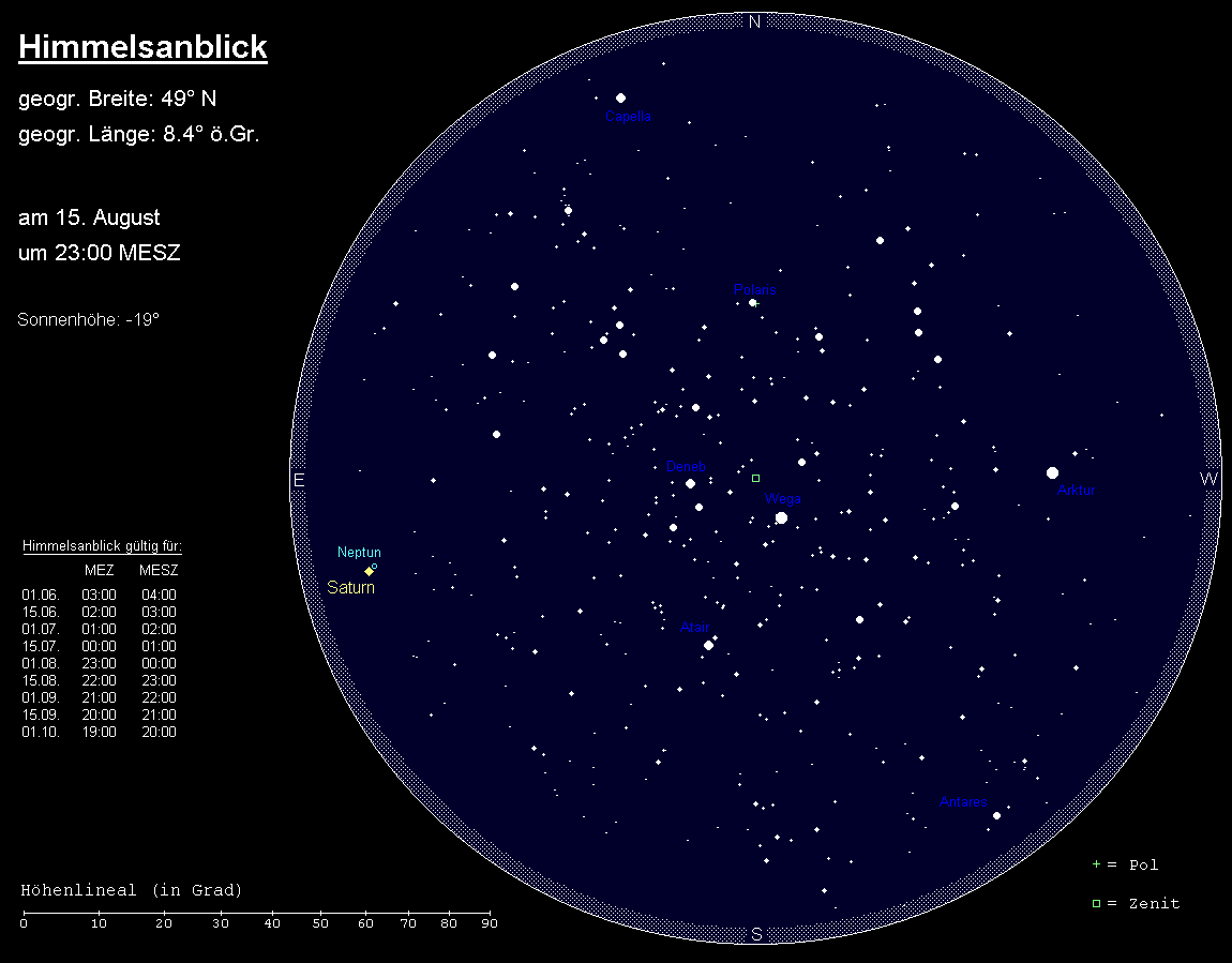 Im August ist zu den Standard-Beobachtungszeiten (24:00 MESZ zu Monatsbeginn, 23:00 MESZ zur Monatsmitte und 22:00 MESZ am Monatsende) die astronomische Dämmerung bereits beendet und somit der Sternenhimmel in seiner ganzen Pracht beobachtbar.