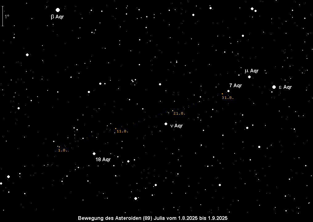 kommt am 11. August im südwestlichen Teil des Sternbilds Wassermann in Opposition zur Sonne und ist dann 8.5m hell. Zu Monatsbeginn ist sie erst 8.8m hell und zum Monatsende ist ihre Helligkeit bereits wieder auf 9.0m abgefallen. Da der Kleinplanet Nr. 89 keine großen Horizonthöhen erreicht, sollte Julia zur Zeit der Kulmination aufgesucht werden. Diese findet zu Monatsbeginn gegen 2:15 MESZ, am Monatsende gegen 23:45 MESZ statt.