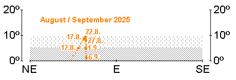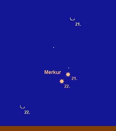 bietet in der zweiten Augusthälfte eine bescheidene Morgensichtbarkeit. Am 1. August steht er in unterer Konjunktion mit der Sonne und entfernt sich in den folgenden Tagen rasch westwärts von unserem Zentralgestirn. Spezialisten können Merkur wohl ab dem 14. August knapp über dem ONO-Horizont ausmachen. Die beste Beobachtungszeit ergibt sich für den dann 0.9m hellen flinken Planeten gegen 5:30 MESZ. Bereits am 19. August steht Merkur, dann bereits –0.1m hell, in größter westlicher Elongation (18.5°). In den folgenden fünf Tagen weist Merkur die größten Horizonthöhen bei dieser Sichtbarkeit auf (beste Beobachtungszeit gegen 5:45 MESZ). Der Mond steht am 21. August 7.5° oberhalb und am 22. August 6° links unterhalb von Merkur. Am 31. August ist der –1.2m helle Planet gegen 6:00 MESZ am besten zu erkennen, wenn er auch bereits deutlich tiefer steht als eine Woche zuvor. Im Teleskop kann bei sehr gutem Seeing in den ersten Tagen eine 8“ große, schmale Sichel erkannt werden, die in den folgenden Tagen, bei zunehmendem Beleuchtungsgrad, rasch kleiner wird.