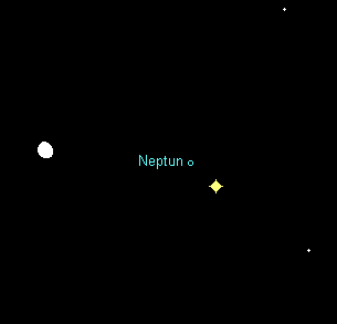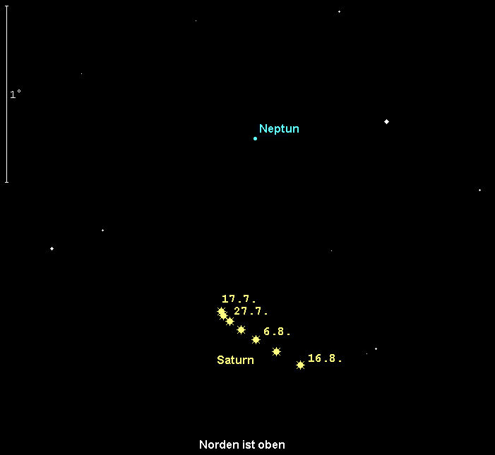 bewegt sich rückläufig durch den westlichen Teil des Sternbilds Fische, nahe bei Saturn. Der 7.8m helle Planet geht zu Monatsbeginn gegen 22:45 MESZ auf, am Monatsende gegen 20:45 MESZ. Etwa zwei Stunden später kann er in einem Fernglas erkannt werden. Am 6. August passiert Saturn den fernsten Großplaneten erneut, dieses Mal in 1.1° südlichem Abstand. Am 12. August steht der fast volle Mond in der Nähe und dürfte Beobachtungen stark erschweren.