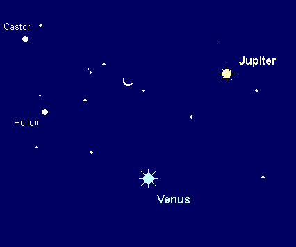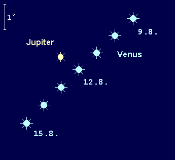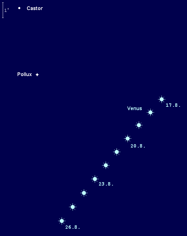 dominiert weiterhin den Morgenhimmel. Ihre Helligkeit geht leicht auf –3.9m zurück. Die Venusaufgänge verlagern sich im Monatsverlauf von 3:00 MESZ auf 3:45 MESZ. Vom Sternbild Zwillinge in das Sternbild Krebs ziehend, nähert sie sich dem offenen Sternhaufen der Praesepe. Am 12. August passiert sie in nur 0.9° südlichem Abstand den strahlenden Jupiter – ein spektakulärer Anblick. Am 20. August bildet die abnehmende Mondsichel mit Venus und Jupiter ein auffälliges Dreigestirn, wobei sie sich 6° oberhalb der Venus befindet. Schließlich passiert Venus am 21. August den hellen Stern Pollux in 7° südlichem Abstand. Im Teleskop präsentiert sie ein Planetenscheibchen, dessen Durchmesser von 14.5“ auf 12.5“ schrumpft, während der Beleuchtungsgrad von 75% auf 84% anwächst.