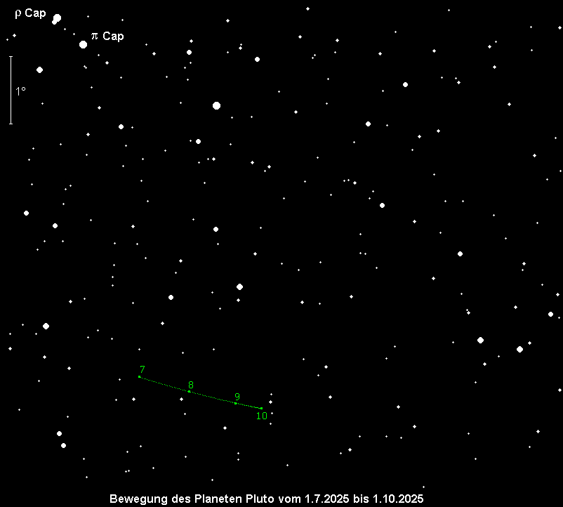 stand Ende Juli in Opposition zur Sonne und steht nahezu die ganze Nacht über dem Horizont. Da der Zwergplanet aber nur 14.4m hell ist und zudem – im Sternbild Steinbock – nur geringe Horizonthöhen erreicht, muss er in den zwei Stunden um die Kulmination aufgesucht werden, was selbst mit einem 30cm-Teleskop nicht einfach ist. Die Kulmination ereignet sich zu Monatsbeginn um 1:15 MESZ, am Monatsende um 23:15 MESZ. Die drei Aufsuchkarten sollen bei der Identifikation behilflich sein.