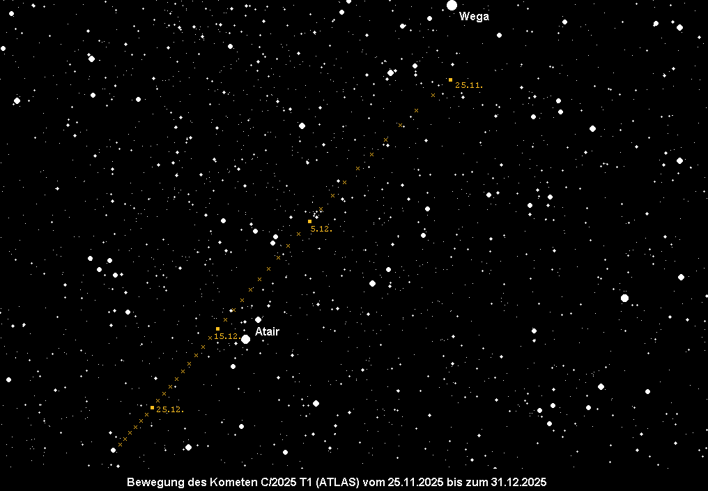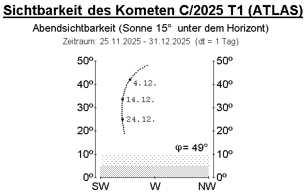 Mit dem Kometen C/2025 T1 (ATLAS) kann in den nächsten Wochen ein weiterer Schweifstern mit kleineren Instrumenten am Abendhimmel verfolgt werden. Allerdings weist er eine recht diffuse Koma auf, so dass er unbedingt von einem dunklen Standort aus beobachtet werden sollte.