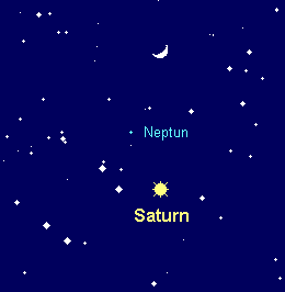 bewegt sich rechtläufig im westlichen Teil des Sternbilds Fische, nahe Saturn, der als Aufsuchhilfe dienen kann. Der 7.9m helle fernste Großplanet kann in einem besseren Fernglas ausgemacht werden. Geht er zu Monatsbeginn gegen 23:30 MEZ unter, so erfolgt sein Untergang am Monatsende bereits um 21:30 MEZ. Zwei Stunden zuvor wird er in den horizontnahen Dunstschichten unsichtbar. Bis zur Monatsmitte kulminiert Neptun erst, wenn die Dämmerung abgeschlossen ist, danach steht er bei Dämmerungsende bereits westlich des Meridians. Am 23. Januar findet man den Mond 3° oberhalb der Mondsichel. Teleskopische Beobachtungen müssen gleich nach Dämmerungsende erfolgen. Dabei zeigt er ab 200x sein nur 2.3“ messendes Scheibchen. Mit größeren Instrumenten kann der 13.5m helle Mond Triton im Abstand von maximal 16“ vom Planeten ausgemacht werden.